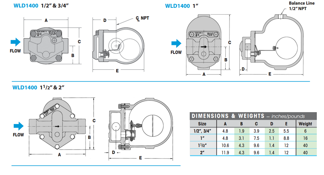 The WLD1400 Series Liquid Drainers are used on air and gas applications as drip traps on piping runs as well as drainage for systems and various process vessels that have moderate condensate loads.